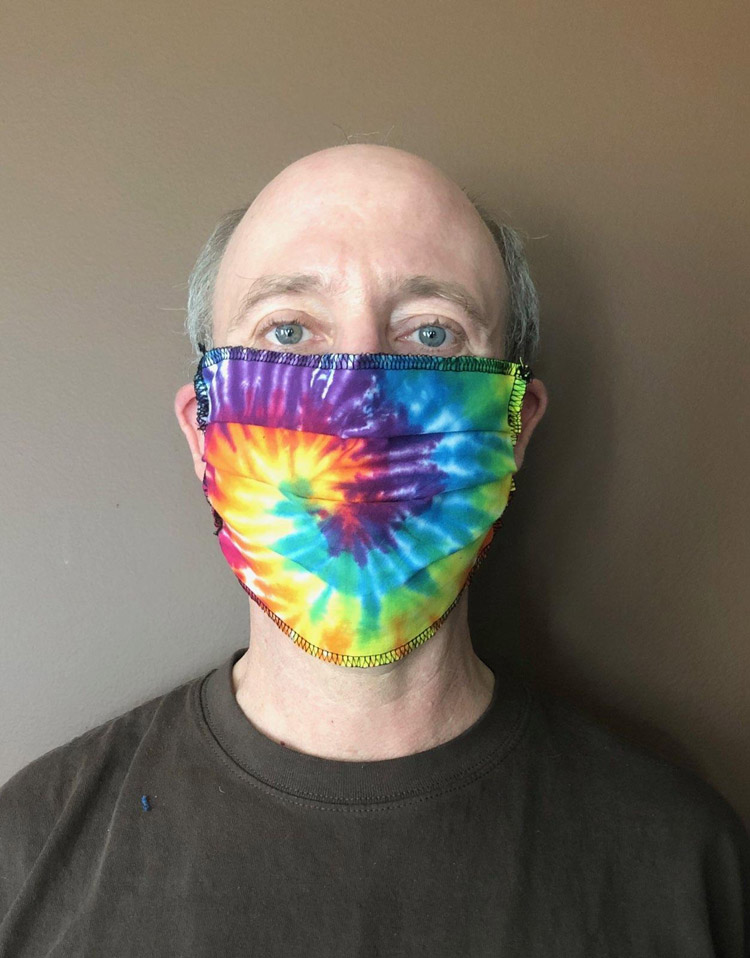 Tie-dye surgical mask style. Single layer of tie-dyed fabric with a quarter inch elastic band that stretches over the ears. 100% cotton fabric has received four wash and rinse cycles after being dyed. Wholesale pricing is available.